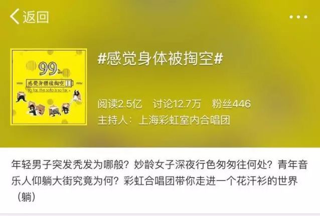 昨天一整天,榜妹的朋友圈都被一首神曲刷屏了。歌名很污,叫《感覺身體被掏空》。在好奇心的驅使下榜妹聽完了,沒想到,其實太魔性,于是背著老板聽了一遍又一遍。 假如你還沒有聽,趕快戳下方視頻! 聽完你一定會轉發的 不得不說,這首神曲又將成為霸占輿論高地的一枚爆款。而這首神曲的背后創作團隊——上海彩虹室內合唱團, 這次是如何在短時間內打造出爆款神曲的呢? 昨天上午9點40分左右,“上海彩虹室內合唱團”推送了一篇《“汪汪汪!汪汪汪汪汪汪汪汪!”》的文章,其中插入了這首《感覺身體被掏空》的短視頻。與此同時,其官方微博也發布了該視頻,并配文“年青男子突發禿發為哪般?妙齡女子深夜形色匆匆往何處?青年音樂人仰躺大街畢竟為何?” 發布八小時后,公家號文章迅速破10w+,并且在當晚11點,該視頻在秒拍的播放數達到1111萬。 截至到今天下戰書14點30分,這篇《“汪汪汪!汪汪汪汪汪汪汪汪!”》閱讀達到14萬,后臺粉絲增長13000。 @上海彩虹室內合唱團 發布的這條微博閱讀達到1796萬,轉評12萬,點贊3萬。意外之喜是,僅僅一天的時間,微博的粉絲就從原先的1.5萬增長至7.5萬,凈增6萬粉絲,秒拍上的視頻播放量也達到了1842萬。