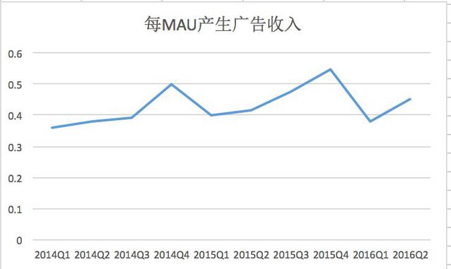 這張圖反映的是每MAU的廣告營收,今年一季度,微博達到0.38美元,二季度達到0.45美元。摩根斯坦利對亞洲同類公司這個指標給出的數據是:0.76美元(一季度)。Facebook在亞洲,這個數字是1.5美元(一季度)。 眾所周知的是,新浪擁有可能是中國最好的互聯網廣告銷售步隊。在諸家門戶中,它單個流量所能帶來的廣告銷售,即便面臨中國流量排名第二的騰訊QQ.com,也涓滴不落下風。 但微博的廣告銷售效率并不高。 2016年一季度,微博的CPM價格為15元人民幣,而微信朋友圈廣告的CPM價格達到60元人民幣,本日頭條為40-50元人民幣。 微博背后是100萬廣告主,長尾效應的確和朋友圈廣告、頭條廣告不同。微博CPM價格較低,對廣告主誠然是好動靜,但對微博,可謂效率還有待進步。 這些數字當然可以說明微博并沒有走到已無上升空間的境地,但同時,也可以說明,未來微博的主要重點是:打磨產品以進步DAU與MAU之比,晉升效率以進步CPM價格。 這是微博三季度、四季度財報發布后,應該關注的重點指標。 |