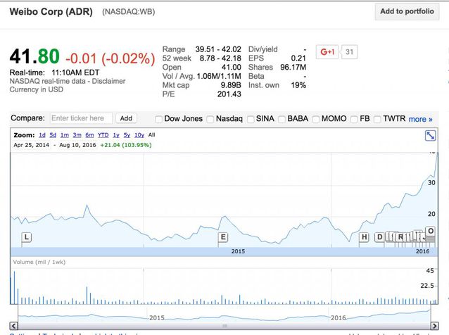 微博發布2016年二季度財報,業績相稱亮眼,利潤同比大漲5倍有余。 在中國互聯網這二十多年的發展歷史上,微博算是一個另類。它的獨特點在于,很少有像它這樣被輿論一致看好然后又一致看衰卻又在看衰中崛起的產品。 2011年,微博在輿論看多中走到頂峰,一度有所謂“微博改變中國”的說法。 2012年,微博開始走上下坡路,一個很有趣的現象就是,從“天天都要刷微博”到“現在還有什么人在用微博?” 2014年,微博上市,海內輿論依然不是太過看好,一個很重要的原因在于,微信及其公家賬號平臺吸引了太多的目光。 2016年,微博強勢崛起,到8月份為止,股價已經連拉六個月的陽線。當下股價創下歷史新高,突破40美元。 一 股價的上漲,背后是業績。打2014年上市之后,微博的業績的確讓人滿足。