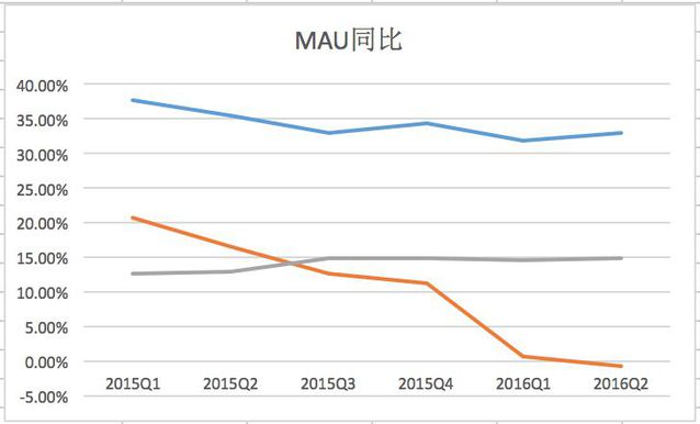 主要體現在銷售、治理及行政用度這一項中。Twitter這一塊開支連續兩年都占據了營收的一半,而微博則較為克制。 這可能是影響利潤的因素之一。說白了,Twitter的職員開支占比比較大。 但這好像很難去解釋為什么Twitter的活躍用戶量一直得不到快速的增長。 把Facebook的MAU季同比增長數據加入后,可以得到如下這張圖: