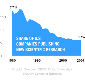 假如將歷史周期再拉的長一點,從1980年到2007年,美國在研發上的本錢比重,降低的速度已然讓人驚奇。尤其是參考在新科學研究領域的專業文章數目來看,已然從17.7%下降到了6.1%。杜克大學的研究教授Ashish Arora表示,從資本市場的反饋來說,越是注重研發的企業的市值,反而不如在研發上投入較小的企業的市值評估。他說,相對于35年之前,現在的企業對于基礎科學的看重減少了,而需求就更少了。