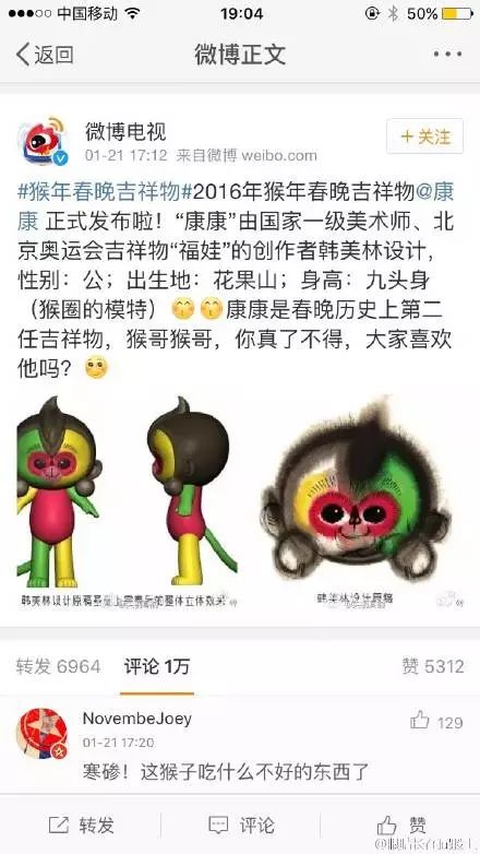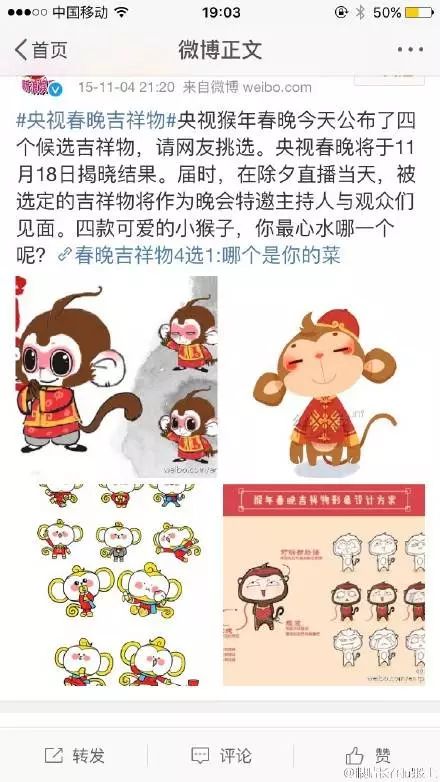 也難怪在央視發布吉利物的半個小時內,評論就已經由萬,微博話題#猴年春晚吉利物#三個小時閱讀量就達811萬,討論5.3萬,登上微博排行榜第一名。
