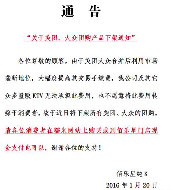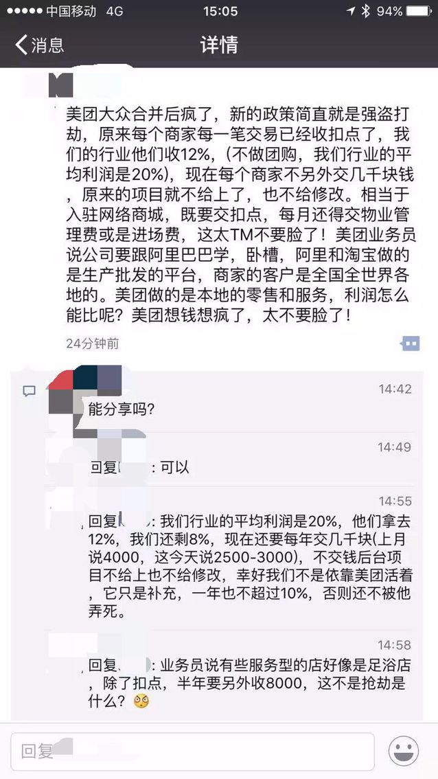 團長君不由迷惑。這豈非是新美大各項業務整合尚未完全結束,就開始從店家嘴里爭食? 回望去年互聯網領域,合并案風氣云涌,但是合并之后,整合之中發生什么題目,對市場產生了什么樣的實際效應,外界卻鮮有分析。從近期美團點評合并之后產生出來的種種效應,我們嘗試著從一個并購案例,看出互聯網合并對市場產生的各種端倪。 我們先來看看這件“美甲店被強收費”是怎么回事,為了更加客觀地了解事情緣由,首席觀察團獨家采訪了這位美甲店老板。 在當事人的要求下,我們暫且以G先生稱呼他。G先生家的美甲店開在三線城市,每年均勻到店消費的客戶分為老顧客和被美團團購業務吸引來的客戶。“我們店開了快十六年,與美團合作是去年一家新店開張時才合作的。實際上,美團帶來的客戶都是很便宜的客戶,成為會員的很少,最優質和不亂的客戶都不是美團帶來的。美團的客戶主要是圖便宜,客質事實上是很差的。與美團合作,我們主要是為了鋪客量。” G先生表示,整個美甲行業的均勻利潤率是20%,百分之八十的同行在這兩年利潤下降都極其嚴峻,美團的新政策無疑讓本來利潤淡薄的美甲行業更加雪上加霜。“兩家合并后,收12%的抽成,這本身就不公道。” G先生頗無奈地說,“大約十天左右前,新美大溘然來了撥新的業務員,跟我講要抽取每年4000元的用度。這幾天又來催我,交2000元。假如不交,店面在網站上的信息就不予更改調整。”G先生表示,這太令人生氣了。“十幾二十塊錢的團購生意,還被剝這么多層皮,我們整個行業還要不要活了?!” 截止到團長君聯系G先生,他表示可能因為朋友圈施展的影響力,新美大的人打電話過來了解了情況,并把網站上拖了半個月不給修改的店面信息修改了。但用度仍是照收不誤。 實際上,涉及新美大壟斷的相關事件一直被多行業職員爆料吐槽。 今年1月,武漢爆發KTV行業對新美大的集體抵制。