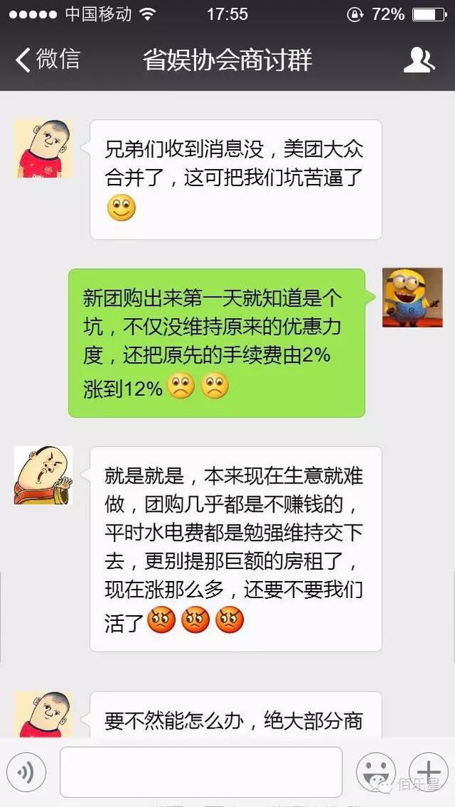 動靜是從一個名為“省娛協會商討群”的微信聊天截圖爆出來的,當事者為武漢KTV商家表示,新美大合并后,將原來的手續費由2%漲到12%,商家在討論群里集體表示,在團購的影響下,業務利潤已經很低了,再多收取抽成點,獲得收益甚至不足以支撐基本糊口。