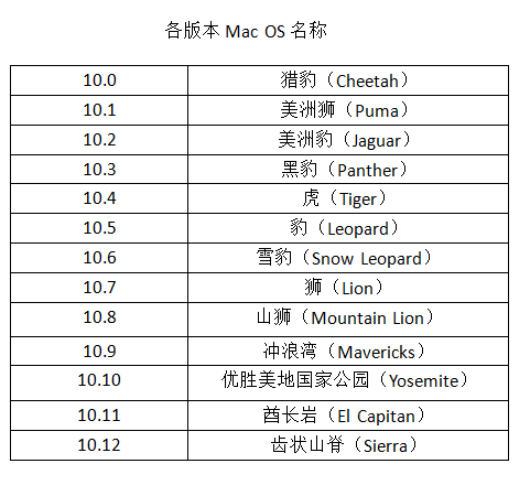 從這些谷歌和蘋果的手機系統命名上,也可以感慨感染到兩家公司文化上的不同。蘋果iOS的命名就是從1數到10,顯的呆板的同時,可能也讓人感覺更可靠。而谷歌的命名方式,顯然就是塑造了活潑呆萌卻并不那么靠譜的小甜心范兒。 但蘋果Mac OS也喜歡花腔命名 不外,實在蘋果也為自己的Mac系統進行過類似的命名。最初是使用貓科動物的名字,之后發現不夠用了,而從10.9開始改用了洛杉磯地名。詳細名稱如下: