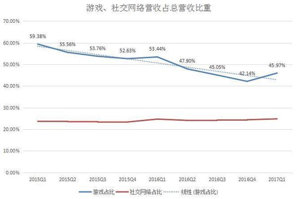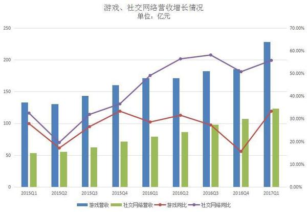 在騰訊發布新一季度財報之前,一眾剖析師都非?春。而在這之前,羅永浩曾直言“騰訊股市漲得比北京房價好”。那么騰訊新一季度的效果到底有剖析師所猜測的那么好嗎?別的收割很多玩家的《玩著榮耀》游戲又給騰訊奉獻了多少收入? 5月17日,騰訊發布了2017財年第一季度的效果陳述。該季度公司的營收為495.52億元(71.82億美元 ),同比增加55%;運營盈余192.72億元(27.93億美元),同比增加44%;公司權益持有人應占盈余為144.76億元(20.98億美元),同比增加58%。 作為早年建立的互聯網公司之一,騰訊的開展也閱歷了幾次大的戰略調整。從近來兩年的財報數據來看,公司的營收和凈利潤增速在持續上升且創了新高。但在2015Q2和2016Q4這兩個季度,營收曾遭受下滑。 騰訊開始以及時通訊東西發家,現在公司的事務現已掩蓋游戲、交際網絡、付出、云核算等。從營收構造來看,公司首要有增值效勞事務營收、網絡廣告事務營收和別的事務營收三大首要來歷。其間,增值效勞事務依然為公司奉獻了最多的收入。 游戲立異高,占總營收比重有所上升 作為騰訊最掙錢的事務大頭,該季度公司的增值效勞營收同比增加41%至351.08億元。 其間,來自網絡游戲的收入增加34%至228.11億元。游戲事務增加首要由智能手機游戲(如《王者榮耀》、《穿越前方:槍戰王者》及《龍之谷》)及PC客戶端游戲(如《英豪聯盟》、《FIFA Online 3》及《地下城與勇士》)所奉獻。盡管這次騰訊沒有發布《王者榮耀》的詳細效果,但上個季度公司曾泄漏游戲的日活潑用戶超越了5000萬。 詳細來看,來自PC客戶端的游戲收入為141億元,同比增加24%;來自智能手機游戲的收入為129億元,同比增加57%。 別的,來自交際網絡的收入增加56%至122.97億元。該項收入增加首要反映數字內容效勞(包含數字音樂、視頻及文學效勞)及虛擬道具銷售收入的增加。 近來幾年,經過自研IP游戲、代理游戲以及“買買買”的方法騰訊現已是全球最掙錢的游戲公司。正如剖析師所猜測的,騰訊的游戲收入又帶來了“驚喜”——創了前史新高。 不過,為了疏解收入構造單一帶來的潛在危險,騰訊一向都在擴大別的事務的營收,然后降低游戲在總收入中的占比。 從游戲和交際網絡營收增速的比照圖來看,近來兩年時間里前者都要慢于后者。從這兩項事務占公司總營收的比重來看,交際網絡一向保持在20%-30%之間。而游戲收入占比則在直線降低,在2016Q2降低至50%一下,在2016Q4占比僅為42.14%。但到了該季度,占比又有所上升。 網絡廣告營收增速趨于穩定,交際廣告同比增加67% 除了游戲外,網絡廣告算是騰訊要點規劃的事務之一了。 在這之前,騰訊曾調整了廣告事務的人事錄用,以進一步挖掘該事務的潛在價值并提高它的戰略地位。此前還有業內人士剖析認為,未來騰訊也許會開展成了一個以廣告事務為主的公司,比方廣告營收占比高達85%的Facebook。 該季度網絡廣告的營收同比增加47%至68.88億元。但比較2016Q3和2016Q4的74億元和83億元則有所降低。從曩昔兩年的數據來看,來自網絡廣告的增速現已離別之前動輒三位數的增加,而保持在40%-50%之間。 從廣告占總營收的比重來看,比較前幾季度也有所降低,為13.91%。這一數字要低于交際網絡在總營收中的占比。關于廣告事務的開展,騰訊現已在國內外進行積極的規劃,不知道終究是否能取得不錯的效果。 在該季度,騰訊對廣告事務的詳細區分進行了調整。不再是效果廣告和品牌展現廣告,而是按廣告特點和非廣告特點來區分:
