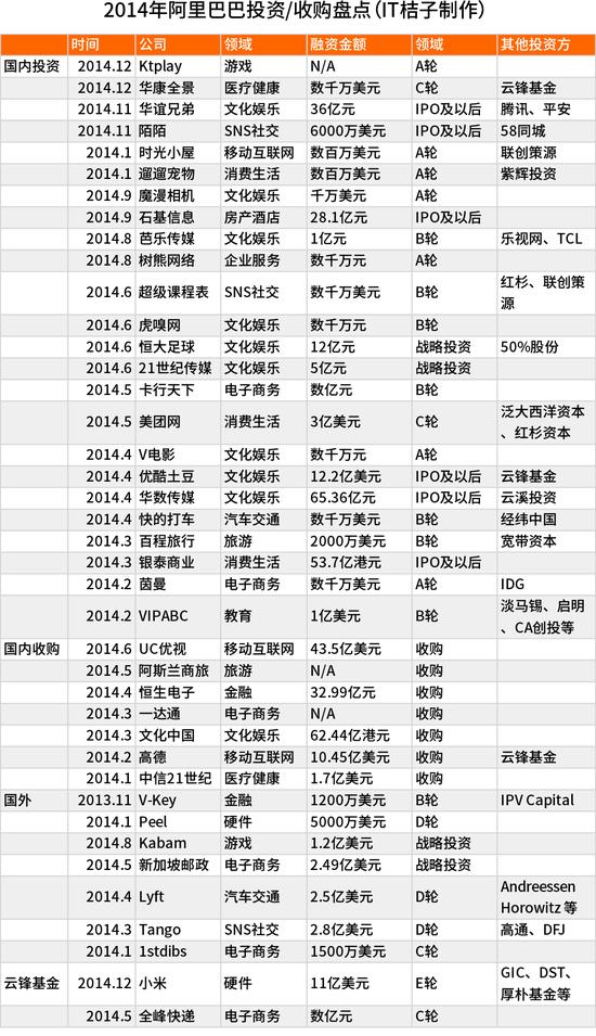 ![]() 2014年的海內互聯網創業投資空前火熱、互聯網的巨頭們布局也如火如荼,一方面是自營業務的不斷擴張,各類平臺各種新產品,一方面是大手筆的投資和并購,從海內到國外,幾乎分布在各個行業,讓整個2014年的海內互聯網版圖風云變幻。 IT桔子(itjuzi.com)是一家關注中國IT互聯網創業投資的數據庫和貿易信息服務提供商,最近發布了《2014年度中國互聯網創業投資清點》,用數據和觀點清點2014年海內互聯網創業、投資、至公司格式、上市、失敗等全方位的信息。 以下是清點內容: 一、阿里巴巴 王者加冕,2014年9月19日,阿里巴巴正式上市,造就美股最大IPO的歷史記實之外,也是其一場盛大的成人禮。 從電子商務出發,阿里巴巴打造了一個很大的貿易生態系統,通過自有業務、資本手段,構建著一個龐大且具備相互協作遠景的貿易大版圖。在這張版圖中,阿里巴巴的“互聯網帝國”囊括了電子商務、金融、本地糊口O2O、教育、旅游、汽車、房產、醫療健康、硬件、游戲等各個領域。與此同時,阿里巴巴的戰略在全球化的生態鏈中,也在開始進一步拓張。 總體看,阿里巴巴在2014年主要圍繞自身貿易生態系統,不斷向內深化、向外拓展,并通過自有業務和資本手段,逐漸在構建一個比擬于在傳統行業做多元化業務(如GE)實現戰略協同不同,移動互聯網時代因其生態性和連接性屬性,自然有利于系統性戰略布局,某種程度上看,阿里巴巴目前在這個方面略勝一籌。 首先,阿里巴巴過去多年核心的貿易模式是B2BC,即通過撬動B端來激活C端,終極實現了從企業級服務向獲取流量進口方向進化,繼而不斷擴大繁衍流量進口。 其次,在演進路徑上,阿里巴巴先從電商平臺服務端開始,積累起用戶規模和交易流量,然后基于電商交易環節打開金融與支付缺口,基于電商配送環節布局線下物流行業,繼而在金融和物流兩個環節再一次挖掘和開釋流量,并將其獨立成又一個具備戰略性意義的節點,圍繞其進行深化布局。接著,阿里再進一步利用海量交易信息扎根到更加基礎層的大數據和云計算技術環節,構建更具普遍意義的底層應用技術系統。 與此同時,在移動和無線領域,阿里一方面將PC端積累的用戶和流量通過移動端產品進行遷移、轉化,另一方面,在移動互聯網布局上,遵循元思索框架從基礎應用層繼承進行戰略布局,推出YUNOS、以及今年的“百川計劃”等,擴展到移動O2O糊口服務和社交等應用場景當中。在這個過程中,阿里同時要面對騰訊、百度甚至是Google、亞馬遜的挑戰,詳細執行和實施層面,必然是會有所得失,這也決定了阿里需要借助資本氣力來快速獲得相關戰略性資源,包括技術、產品以及團隊。 最后,至于阿里涉夠數字娛樂、旅游、健康等領域,目前來看,遠不到開花結果的時候,而是阿里為未來相稱長時間布下的棋子,預埋的種子。當然,上述三個領域目前同樣能夠為阿里的核心主業提供資源嫁接、流量進口甚至是價值變現的可能。 1、阿里巴巴2014度投資并購清點:170億美元 ![]() 從IT桔子數據庫來看,2014年阿里巴巴在投資和收購上特別活躍,先后進行了超過40起的投資、而且一半以上的投資都是大手筆,超過了上億元人民幣,粗略計算阿里巴巴2014年的投資金額超過170億美元。 基于上述分析,結合IT桔子數據庫,我們來大致清點一下阿里巴巴2014年都在哪些方面進行了新的布局。 從投資數目來看,阿里巴巴投資次數最多的TOP5領域接踵是:文化娛樂10 起投資、電子商務6起投資,移動互聯網、消費糊口O2O、SNS社交各有3起投資;從投資金額分布看,阿里巴巴出錢多的TOP5領域是:移動互聯網54億美元、文化娛樂和消費糊口O2O都有30億美元、金融25億美元、房產酒店17億美元。 從海內外分布來看,阿里巴巴在2014年介入了國外7家公司的投資,涉及金額15.34億美元;行業籠蓋比較多,包括電商、金融、硬件、汽車交通、游戲等。 詳細來看阿里巴巴各個細分領域的分布: ![]() 移動互聯網對于阿里巴巴的戰略意義不問可知,但阿里自身在船票方面一直不穩固,在2014年阿里巴巴終于下定絕對收購UC優視,拿到了一張船票的同時也付出了43.5億美元。另外一個大手筆則是10.45億美元收購高德,兩個大額收購讓阿里巴巴在該領域的花費達到近54億美元,成為2014年花錢最多的方向。 文化娛樂也是阿里巴巴非常關注的領域,投資數目最多、金額也非常大,發生了10起投資和并購,總金額接近30億美元,詳細包括:62.44億港幣收購文化中國60%股權并在后面將其進級為“阿里影業”;65.36億元入股華數傳媒,12.2億美元戰略投資優酷土豆團體,12億元投資廣州恒大足球俱樂部,與騰訊、平安一起斥資36億元入股華誼兄弟,5億元投資21世紀傳媒等,此外還有投資魔漫相機、V片子、芭樂網、虎嗅網等。 消費糊口O2O服務是阿里巴巴目前的戰略重點業務,同樣也進行了大手筆投資,包括53.7億港元投資銀泰貿易,介入美團新一輪5億美元的融資,此外還投資了垂直方向上的遛遛寵物,整體金額也接近30億美元。 金融領域,阿里巴巴自身非常強勢、業務線很長,在投資上面也很關注,包括32.99億元入股恒生電子、1200萬美元投資移動安全支付公司V-Key。 電子商務領域,阿里巴巴同樣的上風行業,在2014年的投資數目比較多、但金額不太大,而且大多數投資是在物流行業。物流方面包括新加坡郵政、全峰快遞、卡行天下;此外還有外貿電商服務商“一達通”、美