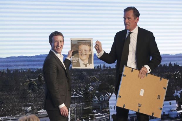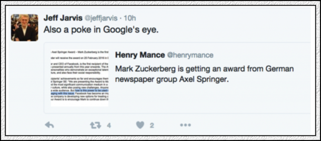 ![]() 【圖說:2月25日晚的“阿克塞爾·施普林格獎”頒獎儀式上沒有獎杯,獎狀或者獎金,但有一樣十分特殊的禮物。一份由柏林最大的報紙B.Z.和Business Insider聯合制作的印刷版報紙。在這份報紙上,小扎上了頭條。小扎很輕易上頭條,但是,印刷版報紙的真頭條,僅此一回! 十分期待在柏林,一個新媒體巨人,一個傳統媒體巨頭,能在以立異為標識的“阿克塞爾·施普林格獎”頒獎儀式上擦出點火花來。傳媒業在全球范圍內,都身處“立異者的窘境”之中;ヂ摼W科技新貴與傳統媒體望族之間,可以泛起一些什么樣的化學反應,把新聞業做為一種事業一種工業帶到新的高度? 【圖說:施普林格總部大樓內的頒獎現場。德國人其實,場面并不大,但規格不低。下圖左一為歐洲議會議長! 【圖說:施普林格官網及其旗下的眾多報紙,發布了良多照片造勢,但這樣“哥倆好”的畫面及會場全景只能辛勞地到俄國人發布的視頻中去截圖。RT威武! 歐洲反谷歌旗手、阿克塞爾·施普林格團體CEO馬塞亞斯·多夫納(上圖為小扎頒獎者)在頒獎儀式上給了扎克伯格高度的評價,這樣的評價大家早就耳熟能詳了,值得引述的只有這一句,“Facebook 作為一個成功的分發平臺,是媒體的公平(fair)伙伴”。這句話,可能半真半假,似是而非,良多媒體人與媒體機構是并不認同的。多夫納心里,可能也并不完全是這樣想的,只是,與谷歌比擬,他們還沒有反目。 扎克伯格在儀式上,也只撿大家愛聽的講。好比,他在獲獎感言中揄揚自己換尿布的技術如何高明,花20秒就可以搞定。他也不忘了談一下他的標牌性T恤。這些輕松的話題,讓他與一房子的老歐洲精英們一起會心地微笑。那些嚴厲的具有爭議的重大方向性話題,以及門外零星的抗議者,換個場合再議吧。 為了表示對于頒獎者的尊重,小扎換了身西服,但是,為了表示他不向金科玉律屈服,他仍舊率性地不戴領帶。 【圖說:在谷歌陣營的人看來,這場流動來者不善。聞名的親谷歌學者杰夫·杰維斯開玩笑說:這不是戳谷歌的眼睛嗎!】 谷歌是傳統媒體的敵人,臉書也是。不外,此一時,彼一時,合縱聯橫的政治婚姻、神圣聯盟隨時都會泛起。傳統媒體指望通過這樣的借力使力,在縫隙間生存,讓自己借機發展壯大,是一廂情愿的。但是,傳統媒體的確不能關起來門來自娛自樂,孤芳自賞,必需與狼共舞,踩著高科技的節奏飛上一會。 此外,高科技巨頭們對于新聞業發展的貢獻,也是無法無視的,事實上,后人們在撰寫新聞史的時候,谷歌、臉書這些門外的野蠻人將成為當然的主角,全球各地精英新聞學院出身的精英專業人士,從來不是新聞史臺面上確當然主角,也永遠不會是(很殘酷,是不是?但符合顛覆者不來自內部的鐵律)。施普林格把第一個施普林格獎頒給小扎,小扎當之無愧。而那個沒有泛起在頒獎儀式上助興的谷歌,假如馬塞亞斯·多夫納足夠大度的話,同樣應該在某年授與其一個大獎。由于,谷歌對于新聞業的發展作出的貢獻,比臉書早,迄今為止,也一點不比臉書小。當然,谷歌對于新聞業的轔轢與臉書一樣,怎么評估都不會過份。 歷史,不都是以這樣的方式寫就的嗎? 稍等,新聞業(journalism)這個詞在有了谷歌與臉書之后,是不是需要重新定義了?在中國,有了早年的新浪、網易、搜孤,稍后的 BAT 之后,是不是也需要重新定義了?新聞早就不是原來的那個新聞,新聞業也早就不再是早先的那個新聞業了。 【圖說:對于小扎來說,歐洲并不是一盞省油的燈。他在這里碰到了不少麻煩。25日一大早他在自己的臉書上發了這張在柏林勃蘭登堡門前慢跑的照片,以示親善,為晚上的頒獎禮暖場! 【圖說:小扎還帶了可愛、淳樸的妻子當保鏢,效果不錯。要是他把小小扎也抱來,一定驚艷全場! 【圖說:比爾蓋茨固然不能切身來護駕,但他發來了一段視頻。他告訴大家,在做慈善方面,他有兩個最好的朋友,一個大他25歲,巴菲特,一個小他25歲,小扎。因此,他一定要借此機會夸小扎兩句! 【圖說:這位億萬富翁名叫彼得·泰爾,德國人,是小扎的天使投資人及十幾年如一日的小扎啦啦隊長。他專門來到現場為小扎站臺。實在,他的演講固然有溢美之詞,但最有料。他說:有小扎之前,互聯網是信息與信息的;有了小扎,互聯網是人與人的!