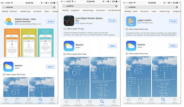 競爭對手和小型應用可以購買樞紐詞 大家擔心導致不良后果 蘋果App Store內的搜索廣告,使用藍色背景,以和其他正常搜索結果作區別,并且也標注AD,認識Google廣告的人會清楚知道這是廣告。不外仍是有人擔心,競價廣告的開放會導致App Store混亂現象的增多。 1.搜索樞紐詞被競爭對手購買。目前已經泛起搜索一些樞紐詞,泛起競爭對手或者其他應用的現象,例如搜索Yelp泛起Eats24,搜索weather泛起其他的小應用