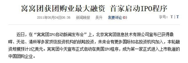 文\X教授(微信公家號:X_Man_Investment) 在大眾創業的背景下,初創企業A輪百萬、B輪C輪數千萬美金的融資新聞,已經不能在科技媒體上吸引眼球與流量了。每隔幾天,就會有此前默默無聞的公司公布進行金額聞所未聞的融資。有趣的是創投界的神話,往往會自我祛魅和揭穿。 虛假融資成風有強烈的內在邏輯驅動。游戲介入方甚至能得到皆大歡喜的局面。對創業者而言,浮夸的數額吸引眼球,能夠成為免費的公關流動,利便拉人入伙、市場拓展乃至遏制競爭對手。 對投資者而言,包裝出來的“欣欣茂發”態勢,利便擊鼓傳花的資本游戲進行下去。易凱資本創始人兼首席執行官王冉,在一次演講中就說過:“一家公司融了3000萬美元,然后新聞報出來就是8000萬美元,融了1億美元報出來可能是3億美元。那既然你這么做了,他的競爭對手看到了,通常競爭對手也會采用同樣的方式。由于做乘法并不難,乘以2、乘以3基本就可以了,然后圈里知道都會這么做,又會除歸來,所以除法也并不難。” 未上市企業因不需要向公家表露企業信息,還能繼承講故事虛報融資;而一旦謀劃上市,遞交包含招股書在內的諸多文件,過去所有的融資真實情況就會暴露,尤以美股市場為甚。 只需要簡樸的英文能力,詳閱招股書,便能發現此間的蹊蹺。進入筆者視野的五家公司,固然間隔上市之初過去了許久,且不乏洗白成功登堂入室者,但恰是作惡者的上行下效,現在虛報融資額之風才越刮越烈,這也是“算舊賬”的意義所在。 有上市潛力的優質創業者介入融資數額造假游戲,最為愚蠢。由于假如公司做的好,很快就會下一輪融資,而一輪要比一輪融資規模大,因此假話將一個接著一個,最后進行證券登記時,假話難圓。 出來混早晚是要還的,筆者收拾整頓的五家互聯網企業:狂風科技、智聯招聘、唯品會、歡聚時代、窩窩團。有的正在遭遇訴訟,有的在被徐徐遺忘,有的雖有可稱為“傳奇”的成功,但未來將如A股走勢般兇險。 第一名: 窩窩團融資額翻4倍報道融資額:2億美元 真實融資額:5500萬美元 2011年5月,窩窩團高調公布首輪融資將達2億美元,是當年團購業內單筆融資的最大規模,融資方為鼎暉、天助、清科等。 以下為媒體報道截圖: