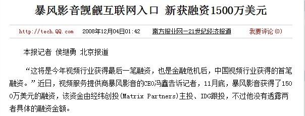 圖5:在招股書financingactivities一欄可以看出,截止到2011年12月31日,YY所有融資金額主要來自老虎基金的7770萬美元。 由圖4也可看出,YY并不止一次虛報融資額。在2009年,YY稱獲2300萬融資,但招股書顯示2009年12月獲C-1輪融資143.9萬美元,C-2輪融資1050萬美元,共計1193.9萬美元,僅為報道融資額2300萬美元的一半。 四、 狂風科技融資金額600萬變1500萬報道融資額:1500萬美金 真實融資額:600萬美金 創造了40多個漲停紀錄的狂風科技,在近期股市持續震蕩大跌之前卻“神奇”停牌,目前股價還保持高位?耧L曾多次謀求登陸美股未果,無奈拆VIE后回歸海內,卻成就了“妖股”,但這時代的幸運兒,也有“黑歷史”。 2008年12月,狂風影音CEO馮鑫公布前一個月獲得1500萬美元融資,由經緯創投主投、IDG跟投,當時的媒體報道截圖如下: