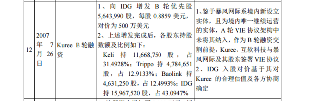 圖6:狂風科技招股書中寫到B+輪融資額為600萬美元,融資方為IDG資本及經緯創投。 2007年4月,狂風影音公布獲得600萬美元融資,但狂風科技招股書顯示,2007年7月B輪融資為500萬美元。