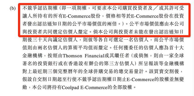 圖4 那么360和酷派的“認沽權”是怎么劃定的呢?可以看出,假如雙方劃定了兩種方式“不競爭認購期權”和“不競爭認沽期權”(圖5),并且分別劃定了相應的權利和義務(圖6-圖8),尤其是圖7,非常具體的劃定了假如違背“不競爭認沽期權”的內容,即酷派不得直接或間接于中國或美國“在與受限制業務相同或相似或與之競爭的任何業務中擁有任何權益、治理、控制、介入、咨詢、提供服務或以其他方式從事,或從事協助”,而眾所周知的是,2015年6月28日,酷派發布的《控股股東出售股份公告》顯示,郭德英家族通過信托計劃持股的Data Dreamland以3.508港元每股的對價向樂視聯系關系公司出售7.8038億股,占已發行總股本的18%,后者曾經推出了多款手機產品,與360、酷派合資的奇酷科技的業務線重疊嚴峻,顯然,酷派這是演了一出“一女嫁二夫”的小算盤,但是卻健忘了當初與360簽署的協議,以及必需履行的義務。