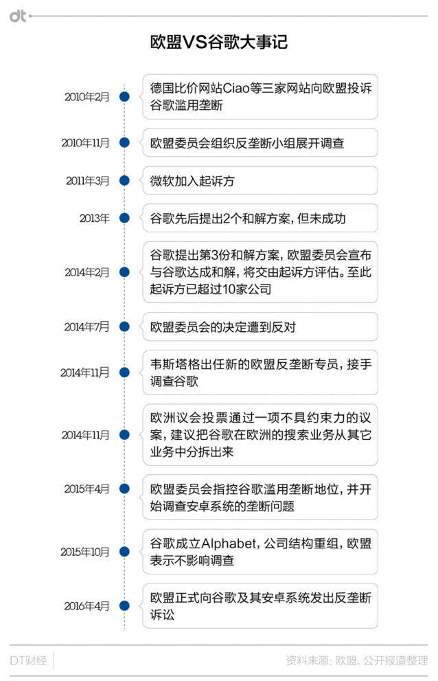 事情大概是這樣的:2010年下半年,幾家搜索及比價網站指控谷歌利用其搜索上風推廣自家服務,損害競爭對手利益。之后歐盟對谷歌的反壟斷調查開始,這一被形容為“史詩級”的訴訟正式拉開序幕。在之后的近6年的調查中,谷歌曾先后三次提出和解方案,但終極都被拒絕。