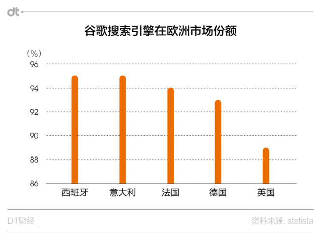 先別急,我們來看一下在歐盟各主要國家,谷歌在搜索引擎市場的占比普遍都超過了九成: