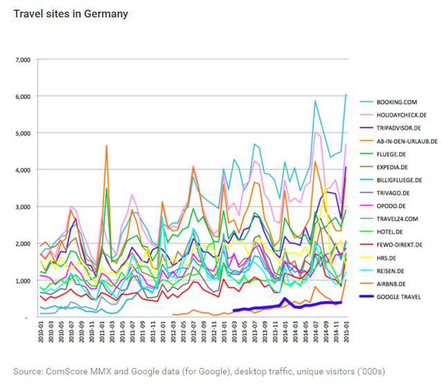 谷歌在遭到指控后作出回應,不無委屈地曬出這些產品在一些歐盟國家可憐的市場份額。谷歌表示,旅行搜索是一個競爭激烈的垂直市場,而自己的據有率實在少得可憐。