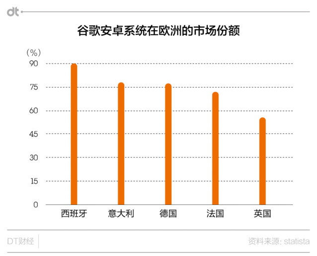 根據statista的統計,安卓在歐洲各國的市場份額很高,在西班牙甚至達到了九成。