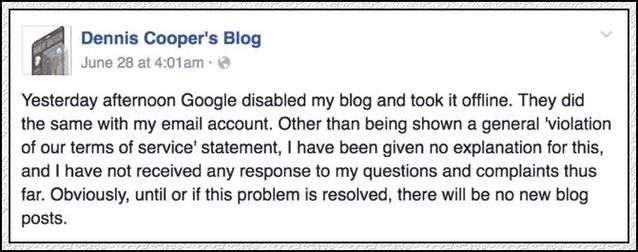 棲身在法國的美國藝術家丹尼斯·庫柏(Dennis Cooper)14年來發布在全球最大的互聯網平臺上的作品溘然消失了,他的谷歌博客、谷歌郵箱同時被刪除。 丹尼斯·庫柏從2002年起開始使用埃文·威廉姆斯創辦的博客平臺Blogger,2003年,谷歌收購了Blogger。今年6月底,庫柏發現他的博客被下線了。同時,他發現自己的谷歌郵箱也被禁用了。 庫柏告訴聞名新聞網站 Fusion 記者伊森·切爾(Ethan Chiel),谷歌沒有給出任何刪除其博客與郵箱的理由。