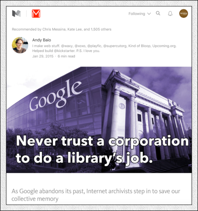 而互聯網檔案通常不僅僅是你我的,互聯網是人類的集體記憶,他們不應該被遺忘。 一位棲身在法國的美國先鋒藝術家的色情作品是不是被消失,坦率地說,根本不必大驚小怪;在《花花公子》雜志自覺自愿地讓其封面少女穿上衣服而不是脫光衣服以吸引讀者的時代,拿風化說事太無聊了。杰羅姆放不下這個話題,一定要說上幾句的原因是,這位藝術家面臨的題目,既不是版權,也不是風化,而是一個人的故事與這個故事存在的權力。每一個人的故事與作品,構成了這個世界與這個時代,只有通過記憶每一個人的故事與每一個人的作品,歷史才有可能呈現自己完整的結構與色彩。谷歌或者其他隨便任何人,在沒有拿得出手的理由的情況下,怎么可以抹去這個人以及他的故事? 當然,這樣戲劇性的情節,仍舊不是題目的樞紐。更讓人驚奇的是,關于互聯網的集體記憶,也在淡出,谷歌在有意無意地拋卻“記憶”,記憶是有本錢的,那些并不能產出利潤的過去,值得以贏利為目的的企業去動用龐大的資源,存檔嗎? 當然,網絡記憶不是谷歌的題目,這是網絡時代的題目!都~約客》雜志去年有一篇十分出色的文章《蛛網:互聯網可以被存檔嗎?》