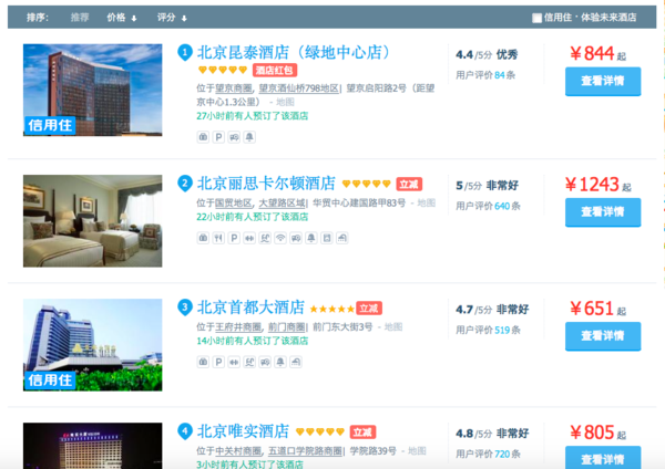同樣以北京地區為例,在攜程的酒店頁面勾選“五星級/豪華”后,泛起的酒店以香格里拉、凱賓斯基、威斯汀、喜來登等高端連鎖酒店、以及國際飯店等單體高端酒店為主?蛦蝺r普遍在800-1500左右。