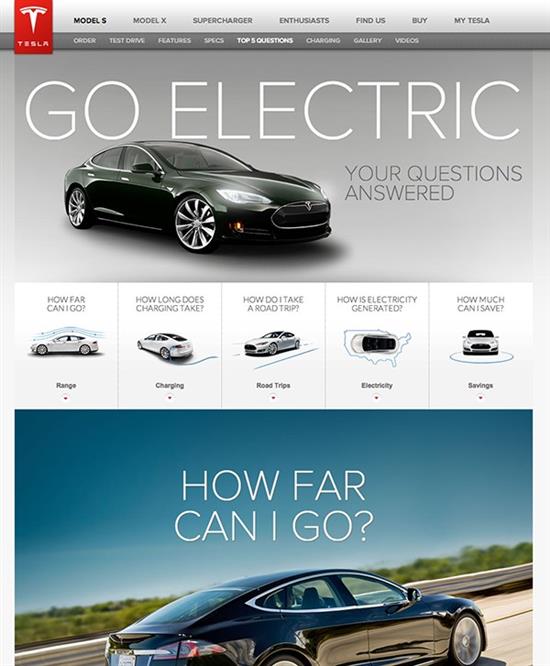 9. 交互式故事 你想把所有的內容聚在一起嗎?假如你的品牌由一系列概念或價值(優雅、創造力,簡約等),從頁面布局到字體選擇,你都能通過頁面元素和交互性故事來闡述品牌和理念。如特斯拉的官網。