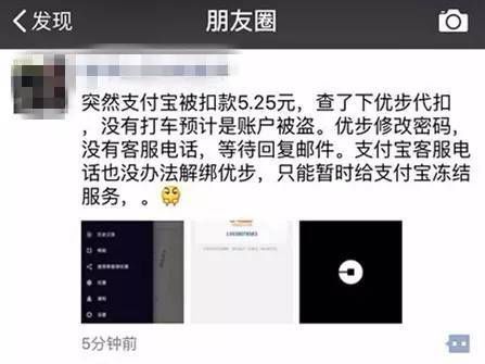 這條朋友圈的大概內容就是,他的優步賬號被盜刷了,而且,除了凍結支付寶,一點辦法也沒有。。。 當然,這有可能是個個例。