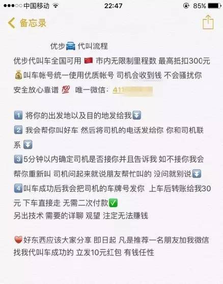 也就是說,他利用一個盜取的賬號幫你叫車,無論路程多遠,你只需要暗里給他 30 元,就可以拍拍屁股走人了。。而實際打車用度,就由那些被盜號的人承擔了。。。 上圖還特么宣傳了可以教你,這樣的技術: 另出技術,需要的詳聊,觀望,注定無法賺錢。 好東西應該大家分享,即日起,凡是推薦一名朋友加我微信找我代叫車成功的,立發 10 元紅包,有錢率性。 (踏馬的,有錢還干這種齷齪事??)