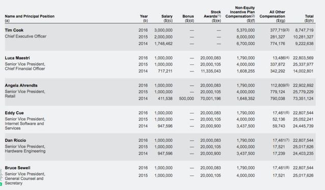 蘋果公司舉例想證實App Store在iPhone銷量下滑的情況下,應用銷售在特定地區是增長的,新游戲推動了應用銷售增長,以及用戶適應訂閱模式愿意長期支付用度。 App Store等服務業務帶來的營收是蘋果公司上一年財報中未幾的亮點,也是蘋果公司高管一直夸大重點發展的業務,即便App Store營收目前還無法撐起iPhone等硬件銷售下滑帶來的負面影響,不外增速老是讓人滿足的,并且App Store營收相稱于純收入,這些都是可以直接計入利潤的。 蘋果公司表示自2008年App Store面世以來,開發者已經獲得了超過600億美元收入,推導可知蘋果公司獲得257億美元的收入,這都是現金流,直接晉升利潤,股東天然滿足。 蘋果公司高管現金激勵減少 但他們收入主要部門是期權 蘋果公司高管接受總薪酬減少的動靜,是SEC文件表露而恰好泛起,這是高管們對蘋果公司總營收下滑負責的一種表現方式,但假如仔細研究高管們的總薪酬,大家就會明白,高管們薪酬減少的絕對值并未幾,這是由于高管們和普通員工薪酬構成的不同。 對于美國的科技公司員工來說,薪酬包括基本薪酬(年薪)、年終獎金以及期權,在年薪固定或每年微漲、期權按工作時間兌現的情況下,年終獎金會影響到總薪酬的多寡。媒體報道中不僅僅是庫克總薪酬減少,蘋果高管們的薪酬同樣受到影響,均勻整體下滑10.5%。在2016年之前的4年,由于蘋果公司年年增長的業績,蘋果的高管是獲得最高額的現金激勵的,2016年蘋果公司的總營收和盈利都不如預期,這也影響到蘋果公司高管們的錢包,但是數據列出來后,大家就會發現高管們總薪酬減少的數額并未幾——對于他們2000萬美元的總薪酬來說,對于普通員工這當然是一大筆錢了。高管們薪酬的大頭是期權,而普通員工比較正視現金獎勵,由于期權總數有限。 詳細到蘋果公司CEO庫克,他的2016年總薪酬為870萬美元,比2015年的1030萬美元減少160萬美元,而這是他基本薪酬從200萬美元增加到300萬美元的基礎上,所以庫克今年拿得手的現金獎金比去年減少263萬美元。 SEC(美國證券交易委員會)表露的蘋果公司文件顯示,蘋果公司CEO Tim Cook(蒂姆·庫克)2014財年薪酬總額為922萬美元,是其2013財年薪酬(430萬美元)的2.1倍,其中包括工資174萬美元,非股權激勵薪酬670萬美元。研究每年詳細的數據可知庫克每年的基本薪酬是在增長的,分別從2014年的174萬美元,2015年的200萬美元到2016年的300萬美元,確定庫克基本薪酬的就是蘋果公司薪酬委員會,這個委員會也決定所有其他高管的薪酬。 對于高管來說,總薪酬比去年降低也不是良多,由于期權獎勵是同樣的。他們總薪酬中的大頭恰是期權獎勵。