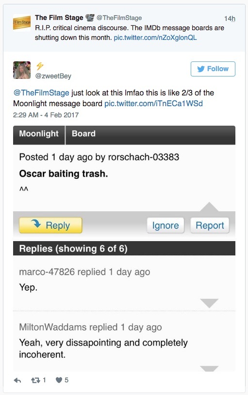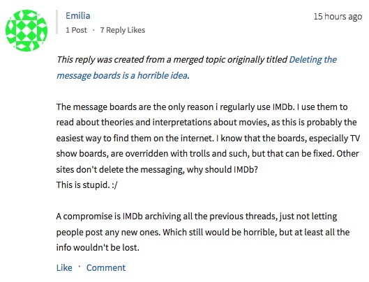 美國時間 2017 年 2 月 3 日,IMDb 公布將于 2017 年 2 月 20 日正式封閉留言板功能(Message Boards),而供用戶進行溝通的私信功能(Private Message)也將隨之下架。 成立于 1990 年,IMDb(Internet Movie Database,互聯網片子數據庫)是國際著名的片子、電視和名人資訊網站,以其“神秘且權勢巨子”的評分機制、龐大齊全的片子電視資料庫著稱。 除了常規的影視基本資訊外(如上映時間、演員和制作團隊、預報片、作品評論等),在每個影視作品條目下還會包括良多“影迷范兒”十足的用戶出產內容(UGC),如:經典語錄(Quotes)、片子漏洞(Goofs)、冷知識(Trivia)、片子原聲等,是不少深度影迷觀影前后必到“圣地”。 影視作品作為一種可解讀性極強的文本,離不開觀眾對于文本甚至人物的討論,而這一任務則由“留言板”來承載。固然名為“留言板”,但該功能實在就是“論壇”,注冊用戶針對不同條目創建話題,發起討論。除了每個影視作品、人物條目下都會配備留言板以外,IMDb 還設置了 47 個主要討論版塊,并有超過600 萬注冊用戶使用過留言板的功能。 (圖自 Reddit) 據聲明,本次對留言板功能的撤銷是經由了“仔細考慮,且基于數據和流量”作出的決定,并宣稱,用戶現已逐漸將討論轉移到 IMDb 的其它官方社交賬號上,如 Facebook、 Twitter、Tumblr 等,原“留言板已不再為全球每月 2.5 億全球用戶提供積極、有用的體驗”。 在 IMDb 的討論區中,動靜一宣布,不少用戶都跟帖表示對該決定的反對,并以為社交賬號并不可替換原留言板的功能。