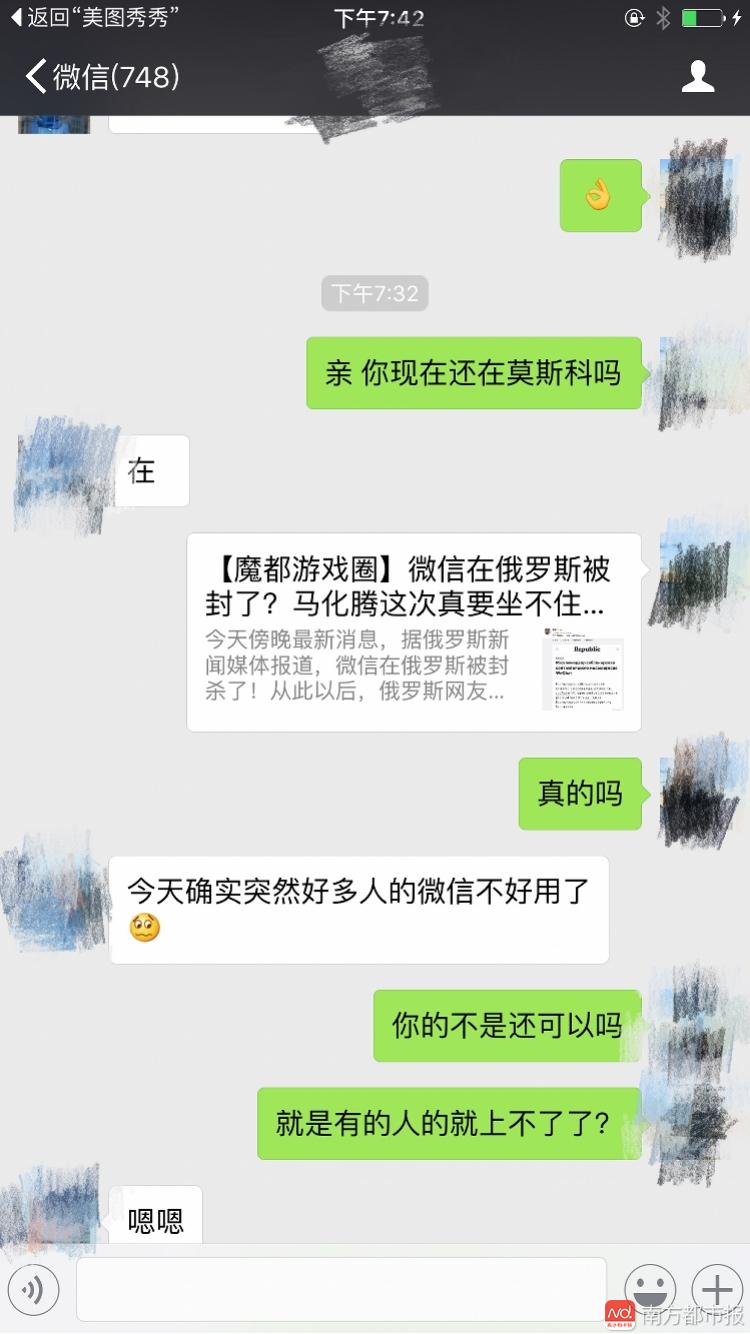 在剛剛,南都記者多方承認,微信在俄羅斯境內被封殺。有多名居住在俄羅斯的人士向南都記者表明,從今天下午開端,俄羅斯境內不少微信用戶呈現徹底無法登入、運用的狀況。有用戶則表明,微信從今天下午開端間隙性“宕機”,時好時壞。 微信方面剛才也向南都記者承認了這一現實,至于詳細因素,還有待微信方面進一步的音訊。 南都記者與俄羅斯人士對話:下午開端網友陸續無法運用微信 ![]() ![]() ![]() 俄羅斯網友改用QQ交流: ![]() |