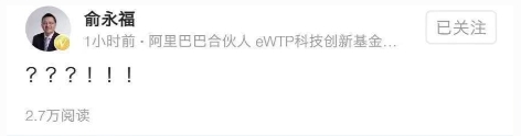 就在楊偉東的新聞爆出后,外界發現前阿里巴巴集團大文娛董事長俞永福發了一個狀態,一個字沒寫,只有三個問號和三個感嘆號。