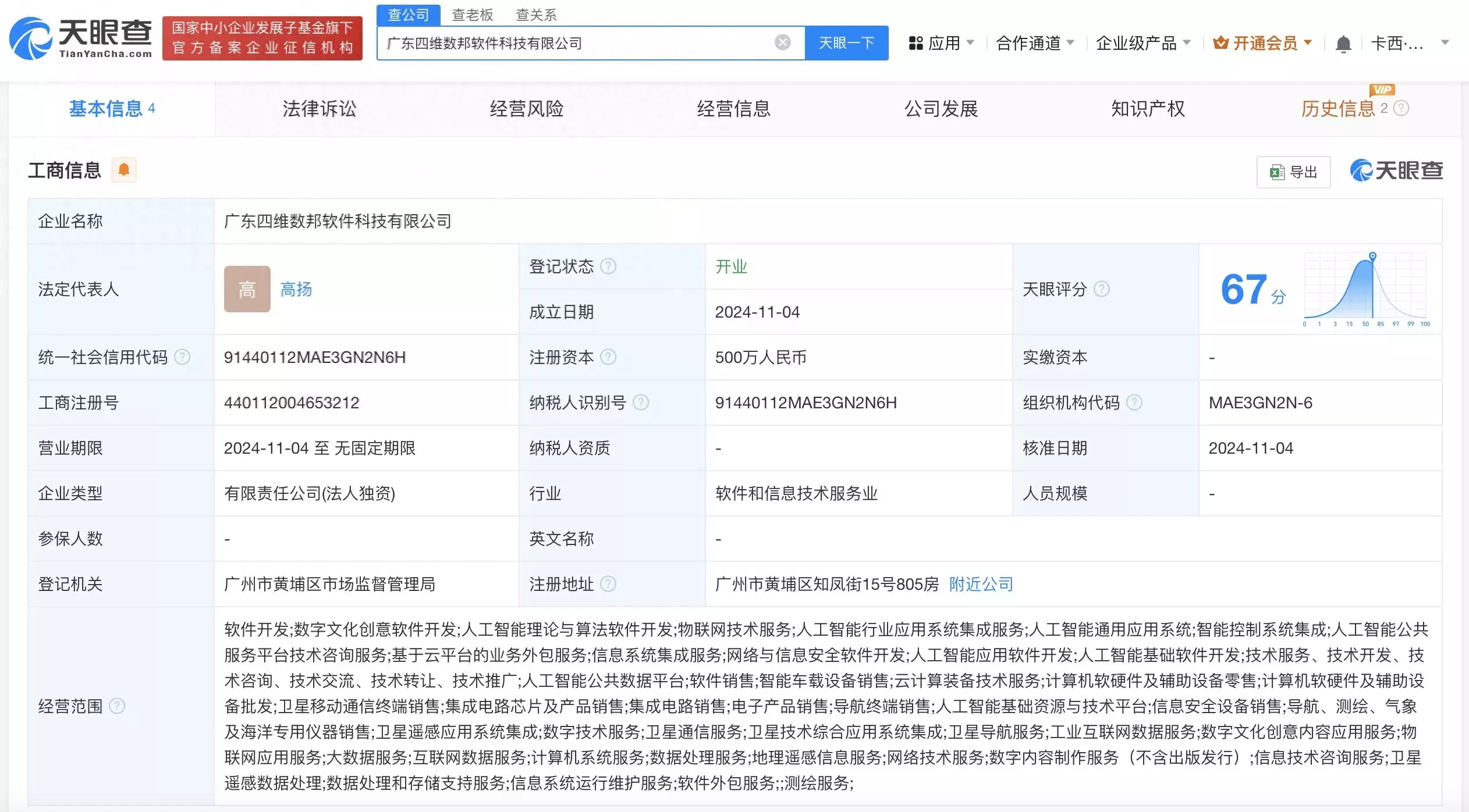 據天眼查 App 顯示,2024 年 11 月,由四維圖新持股的陜西四維數邦科技有限公司全資持股的廣東四維數邦軟件科技有限公司成立,該公司法定代表人為高揚,