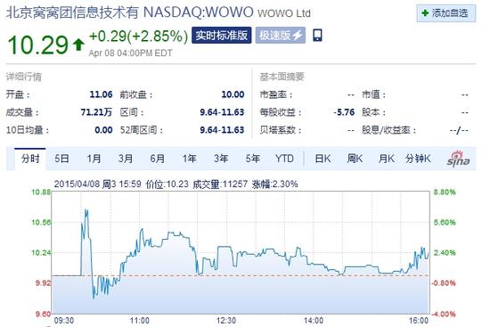 新浪科技訊 北京時間4月9日凌晨動靜,窩窩團在美國納斯達克全球市場成功掛牌交易,股票代碼為WOWO,發行價為每股ADS 10美元,每股ADS