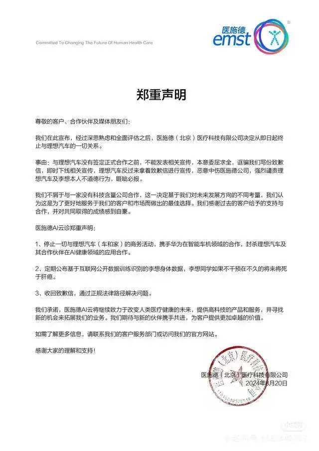 8 月 19 日,一份醫施德發布的與理想汽車相關的聲明在社交平臺流傳。聲明稱,醫施德將從即日起終止與理想汽車的一切關系。 聲明指出,