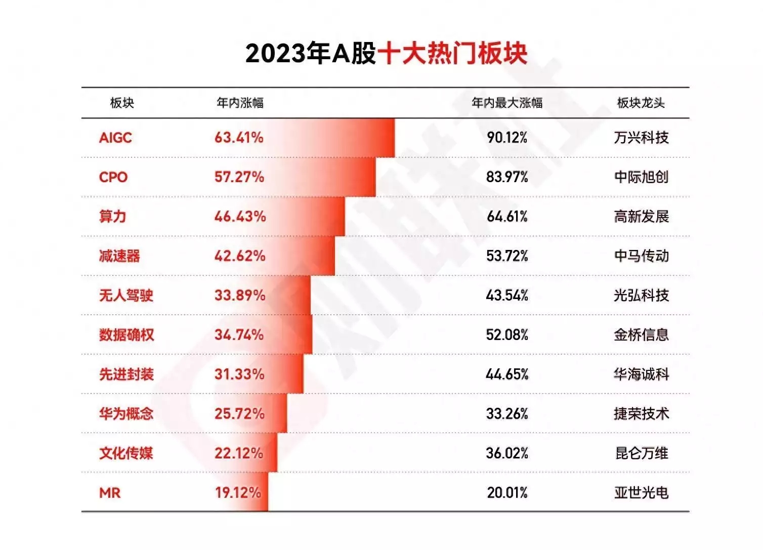 2023年是A股的題材大年,AI浪潮貫穿始終,無論是硬件端的CPO、算力,還是應用端的AIGC都在不斷地推高市場熱度。AIGC全年漲超60%奪冠,成為2023年最賺錢的風口之一。