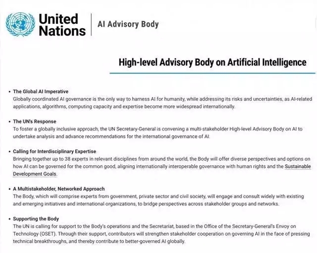 聯合國成立39人咨詢顧問團隊以解決人工智能國際治理問題。 聯合國成立了一個由39人組成的咨詢顧問團隊,以解決人工智能國際治理問題。該團隊由來自世界各地的專家組成,