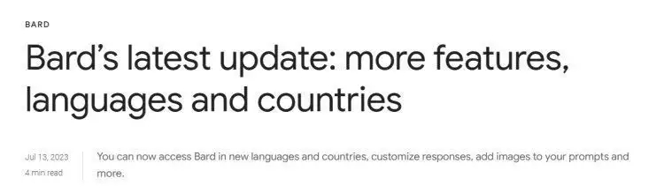7月14日訊,美東時刻周四,谷歌對其人工智能(AI)談天機器人Bard進行了版本更新。谷歌宣告,將向歐盟和巴西的更多用戶敞開Bard服務,