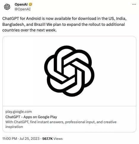 7月26日訊,OpenAI經過其官方推特宣告,安卓版ChatGPT現在在美國、印度、孟加拉國和巴西供給下載,并計劃在下周將其推行至更多國家。