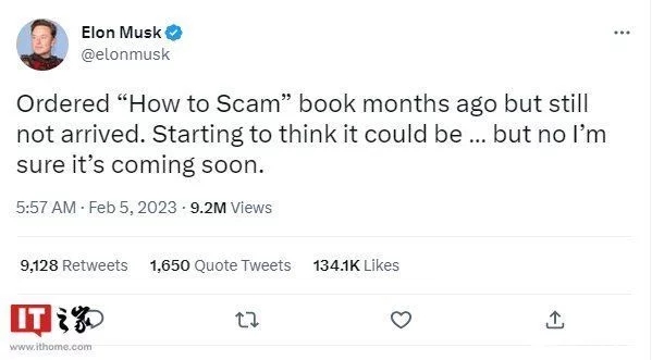 馬斯克發今日推文稱:“在幾個月前訂購了一本叫做《怎么欺詐》的書,但還沒到,開始覺得它可能是... 不,我相信它很快就會到了!