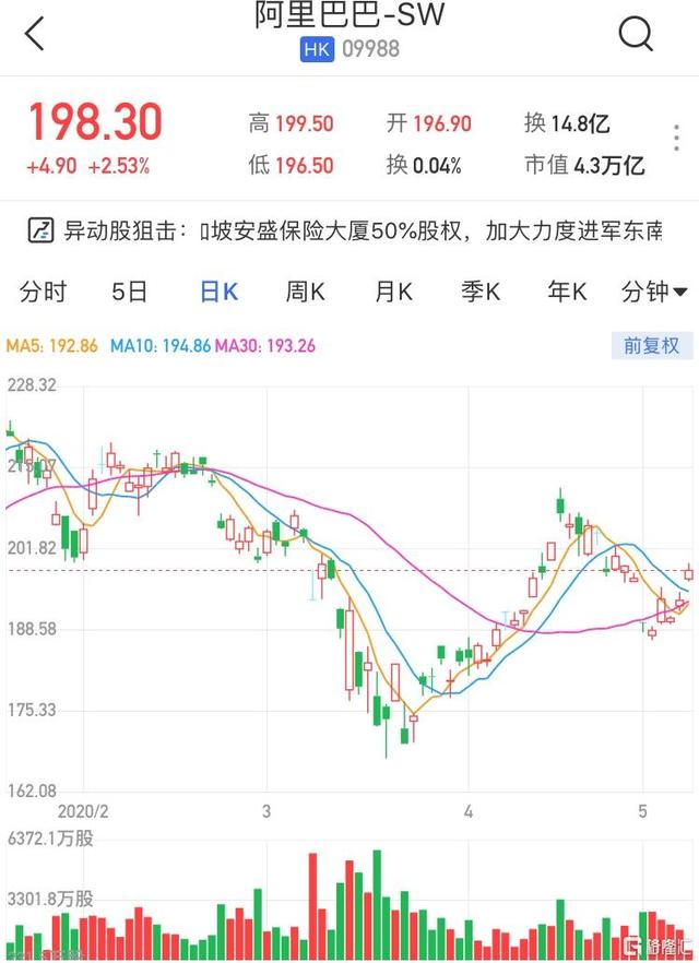 阿里巴巴現報198.3港元,漲2.53%,暫成交14.8億港元,最新總市值4.3萬億港元。 阿里巴巴集團日前宣布,