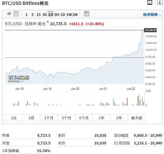 6月22日,比特幣打破10000美元關口,這是自去年3月后,比特幣價格重回10000美元高位,到發稿,比特幣已漲至10735美元。